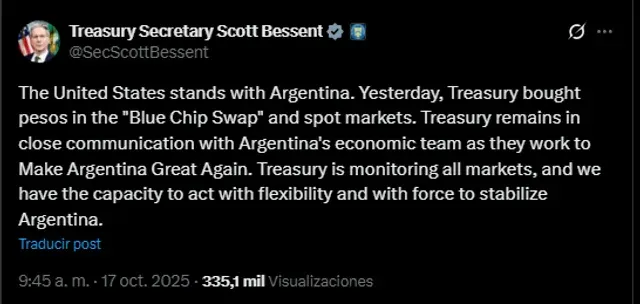 “El Tesoro está monitoreando todos los mercados y tenemos la capacidad de actuar con flexibilidad y contundencia para estabilizar a la Argentina”, aseguró Bessent, el artífice del auxilio financiero que coordinó con el equipo económico que lidera el ministro Luis Caputo. El funcionario argentino reposteó en X el mensaje.