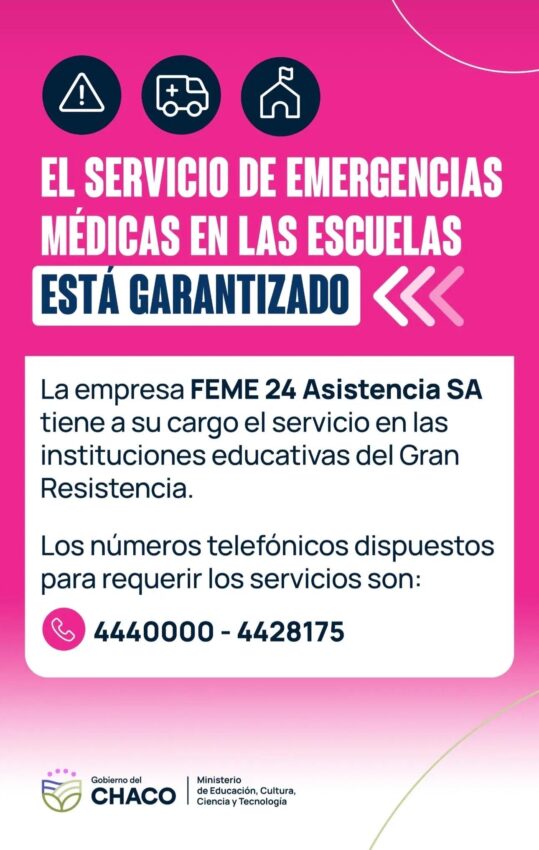El Ministerio de Educación de la Provincia aseguró que está garantizado el servicio médico asistencial de emergencia destinado a la atención de las comunidades educativas de las instituciones escolares de zonas urbanas del Gran Resistencia (que comprende Barranqueras, Puerto Vilelas, Fontana y Resistencia).
