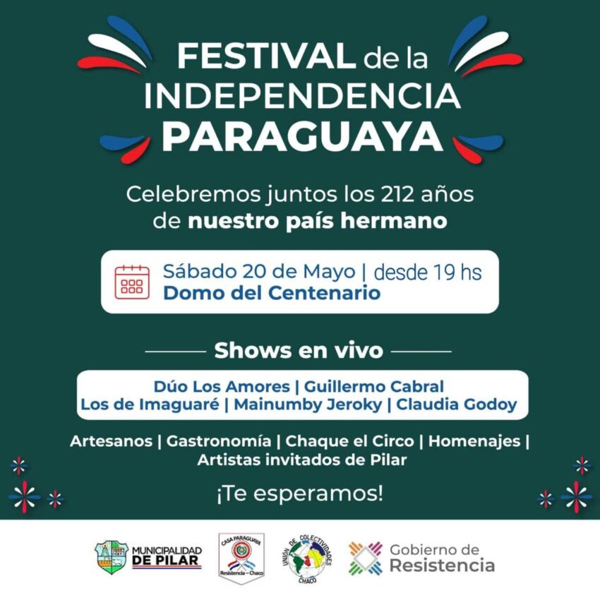 En el marco de la política de espectáculos y eventos culturales llevados adelante por la Municipalidad de Resistencia, además de la hermandad entre la capital del Chaco con el vecino país; el Festival de la Independencia Paraguaya incluirá feria de artesanías, distintas opciones gastronómicas, actuación de Chaque el Circo, homenajes y artistas invitados de Pilar.