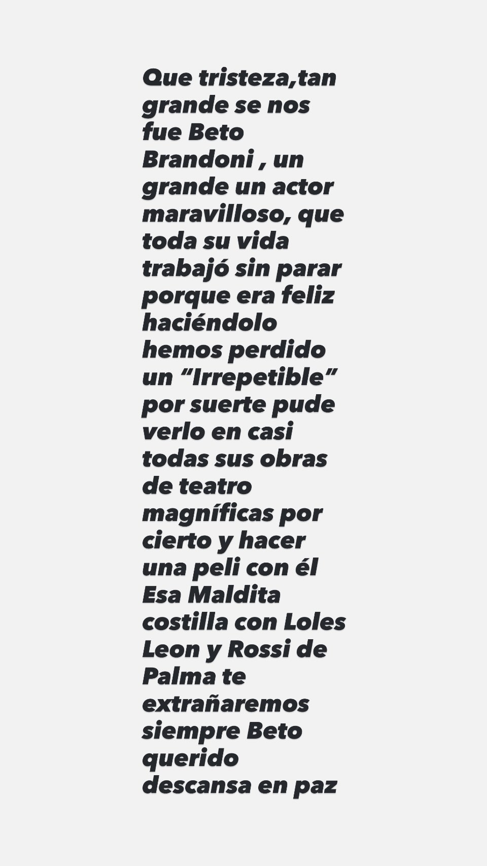 “Lo que era Beto como actor, dios mío. Era increíble. Irrepetible. Un grande. Jamás va a haber otro como él ni tendrá esa voz única que lo ayudó a ser el más grande de todos. Te hacía morir llorando o de risa, era un genio trabajando”, declaró la diva que además compartió elenco con Brandoni en “Esa maldita costilla”, película de Juan José Jusid.